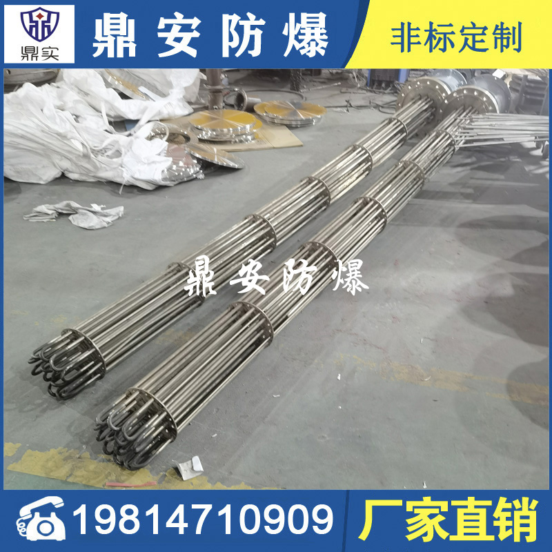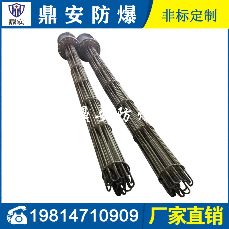 防爆法蘭加熱管是由多支加熱管焊接在法蘭上集中加熱。主要用于敞開(kāi)式、封閉式的溶液箱和循環(huán)系統(tǒng)中加熱用。優(yōu)點(diǎn): 表面功率大,使一般電加熱表面負(fù)荷的2~4倍,高度密集式、結(jié)構(gòu)緊湊。由于整體短而密集,故穩(wěn)定性好,安裝無(wú)需支架。組合式法蘭加熱管大多采用氬弧焊接方式使電熱管于法蘭連接,也可利用緊固裝置的形式,即每支電熱管上焊由緊固件。然后與法蘭蓋采用螺母鎖緊。管子于緊固件采用氬弧焊接。緊固件密封處采用科學(xué)的工藝。單支更換方便,大大節(jié)約以后的維修成本選擇進(jìn)口及國(guó)內(nèi)優(yōu)質(zhì)材料??茖W(xué)的生產(chǎn)工藝,嚴(yán)格的質(zhì)量管理,保證電熱管優(yōu)越的電氣性能。