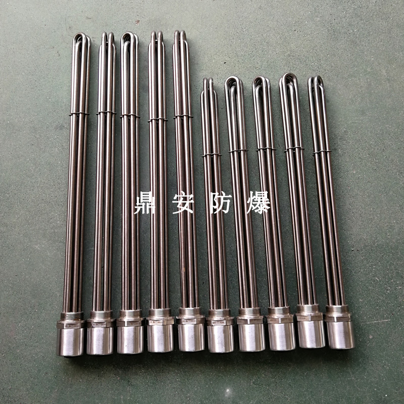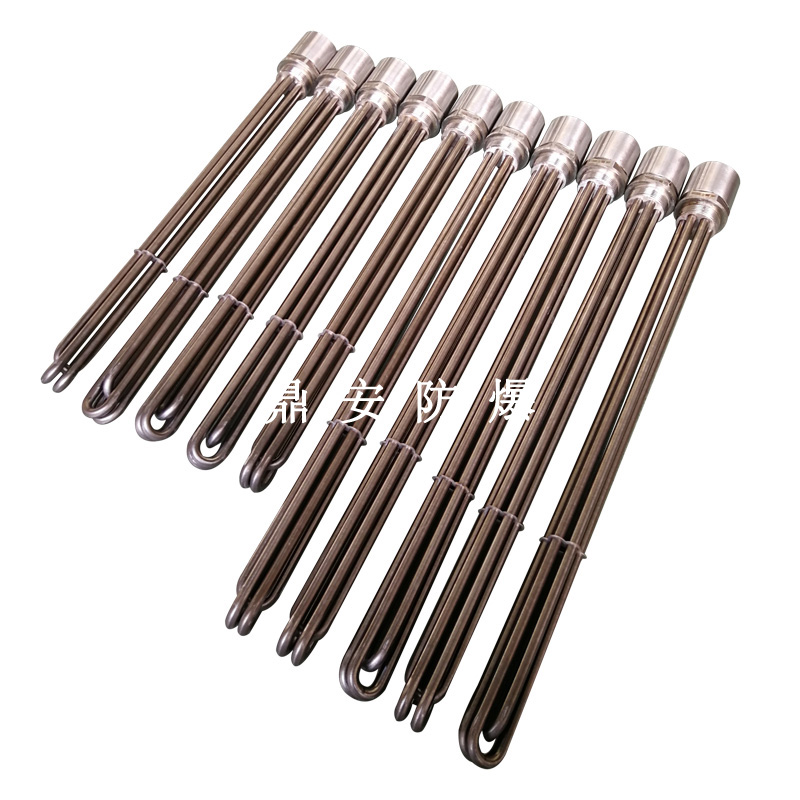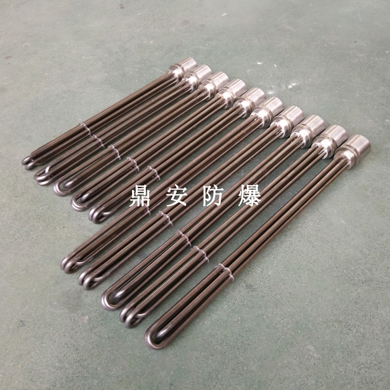 法蘭電熱管(也稱插入式電加熱器):是采用U型管狀電熱元件,多支U型電熱管焊接在法蘭上集中加熱,依據(jù)加熱不同介質(zhì)設(shè)計規(guī)范,按照功率配置要求裝配在法蘭蓋上,插入需加熱物料中,發(fā)熱元件工作時所發(fā)出的大量熱量傳導(dǎo)給被加熱介質(zhì)使介質(zhì)溫度升高,達(dá)到所需的工藝要求,主要用于敞開式、封閉式的溶液箱和循環(huán)系統(tǒng)中加熱用。