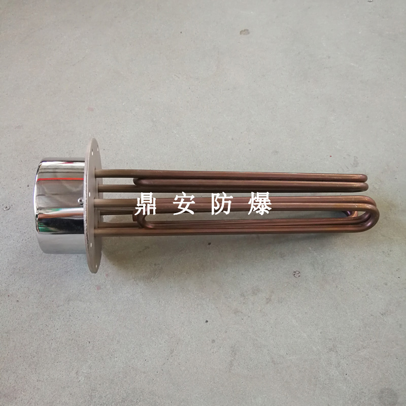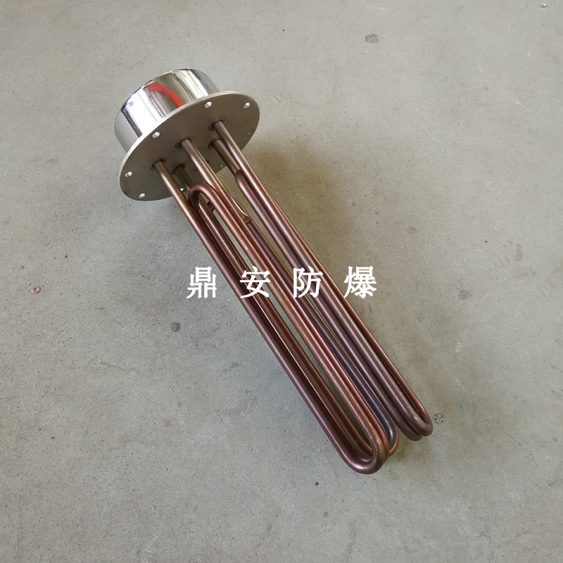 法蘭電熱管(也稱插入式電加熱器):是采用U型管狀電熱元件,多支U型電熱管焊接在法蘭上集中加熱,依據(jù)加熱不同介質(zhì)設(shè)計(jì)規(guī)范,按照功率配置要求裝配在法蘭蓋上,插入需加熱物料中,發(fā)熱元件工作時(shí)所發(fā)出的大量熱量傳導(dǎo)給被加熱介質(zhì)使介質(zhì)溫度升高,達(dá)到所需的工藝要求,主要用于敞開式、封閉式的溶液箱和循環(huán)系統(tǒng)中加熱用。