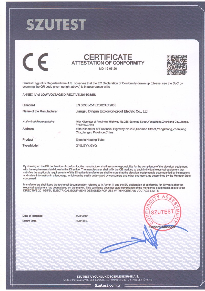 江蘇鼎安防爆電氣有限公司是一家生產(chǎn)和銷售高品質(zhì)電加熱設(shè)備的民營企業(yè)。擁有成套完善的生產(chǎn)設(shè)備和一支技術(shù)力量雄厚的研發(fā)及生產(chǎn)隊伍。主要生產(chǎn)環(huán)保節(jié)能的PTC電加熱器、防爆導(dǎo)熱油爐電加熱器、防爆管道加熱器、防爆風(fēng)道加熱器、單頭加熱管、雙頭加熱管、翅片加熱管、防爆法蘭加熱管等。并為國內(nèi)多家大型科研機構(gòu)及出口企業(yè)配套生產(chǎn)各種電加熱設(shè)備。